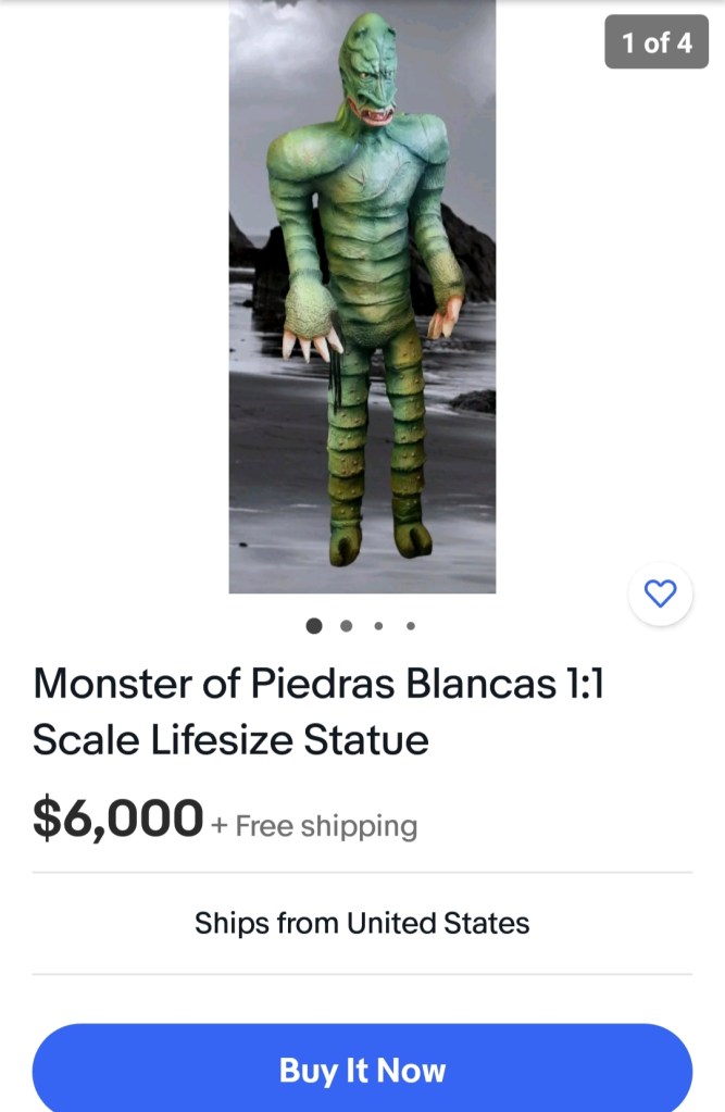wow! how weird! someone is selling a 6’5″ foot 200 pound life size version of the The Monster of Piedras Blancas on eBay for $6,000k dollars