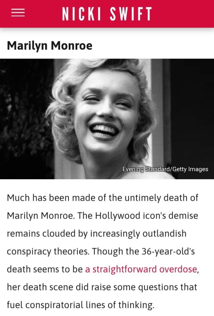 Pinup Icon JEANNE CARMEN is mentioned in this new article on the NICKI SWIFT Hollywood news site talking about MARILYN MONROE..