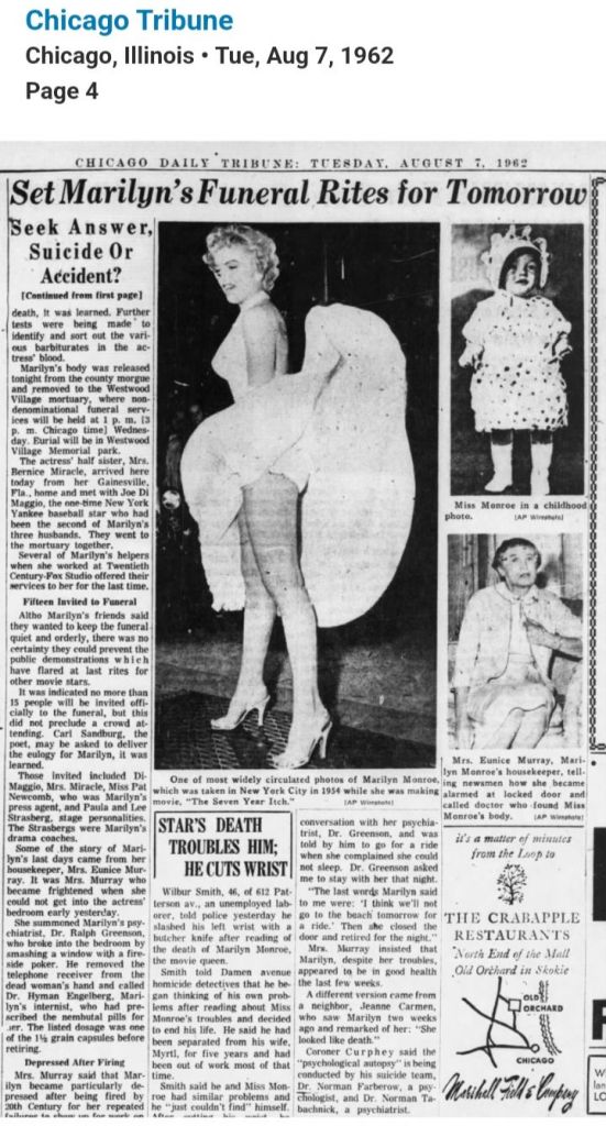 New Newspaper Find: JEANNE CARMEN on MARILYN MONROE in Chicago Tribune July 20, 2024Uncategorized JEANNE CARMEN is quoted in the CHICAGO TRIBUNE on August 7th, 1962 questioning the death of MARILYN MONROE Share this: Click to share on X (Opens in new window) X Click to share on Facebook (Opens in new window) Facebook Click to share on Tumblr (Opens in new window) Tumblr Like Loading... Related