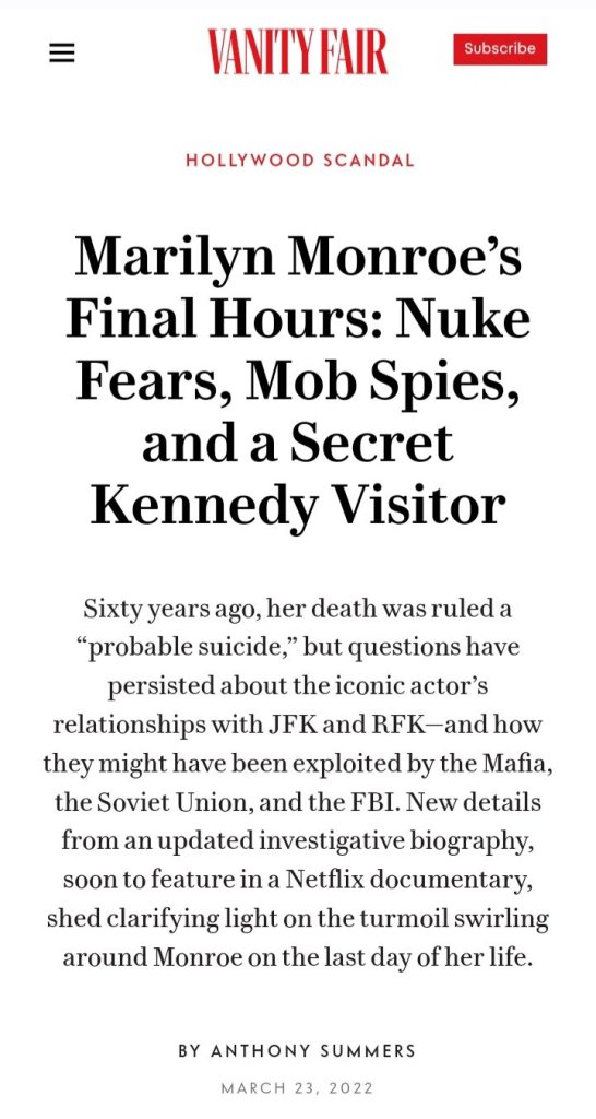 Nella speranza di contattare Bobby chiamò anche degli amici a Washington, inclusi Robert Slatzer e il cognato di Kennedy, Peter Lawford. La mattina della sua morte, ha chiamato l’attrice Jeanne Carmen, la quale a Vanity Fair ha riferito che Monroe sembrava angosciata. “Mi aveva raccontato che una donna l’aveva chiamata tutta la notte, molestata e insultata. La voce suonava familiare, ma non riusciva a darle un nome. L’anonima donna aveva detto frasi del tipo:”Lascia in pace Bobby, putt*na. Lascia in pace Bobby’”. Carmen ha aggiunto che Monroe aveva chiesto sonniferi e vino, ma lei aveva rifiutato di assecondarla. Più tardi, il giorno della morte, un’amica, Agnes Flanagan, andò a casa di Monroe.