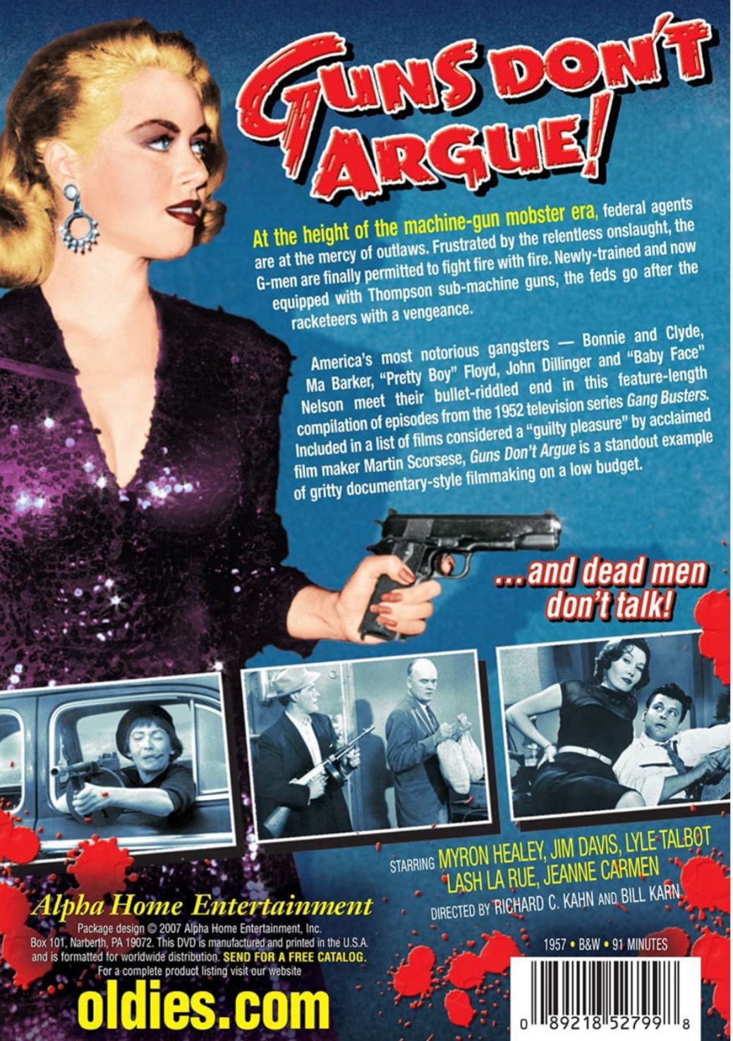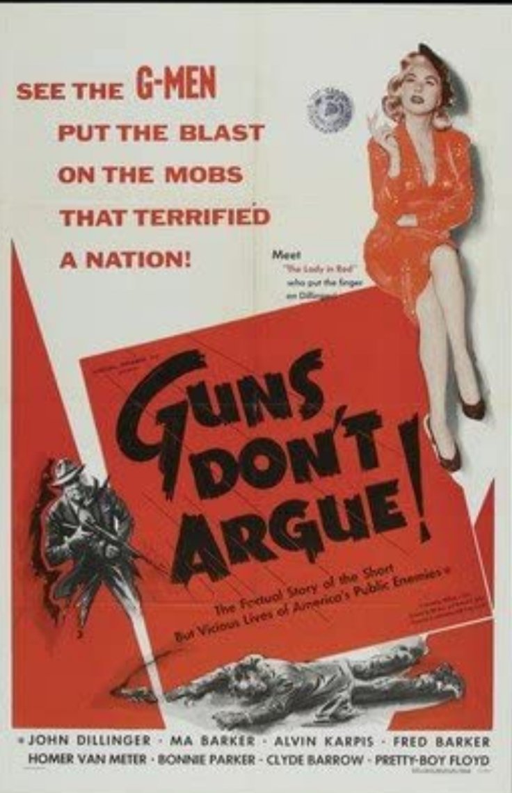 Indeed guns don’t argue. Rarely have truer words screamed from a movie poster, and we’ve come across few titles more fitting for a crime film. What you get here is a narrated docudrama about how U.S. federal agents began to carry guns, and use them. In the past they hadn’t been authorized to do so, but faring poorly against machine gun-toting gangsters like Pretty Boy Floyd, John Dillinger, and Bonnie and Clyde changed that. Pretty soon we see g-men picking off criminals like tin ducks in a shooting gallery, and the narrator drones lines such as, “Like flies to a sticky bun the curious clustered at the sound of the excitement.” Mmm… sticky buns.