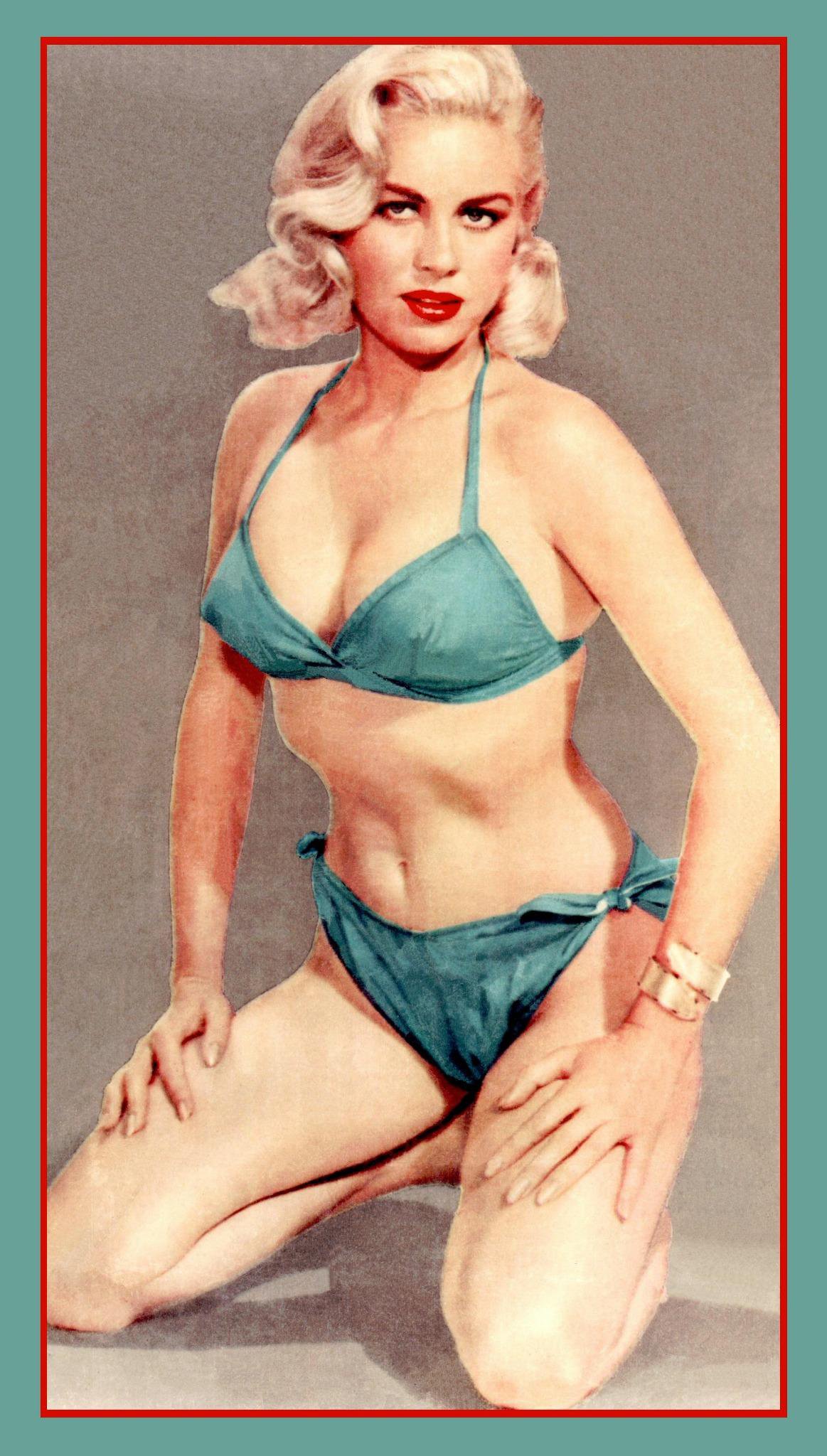 Pinup Icon Jeanne Carmen in a classic photo with green bikini and gold bracelet